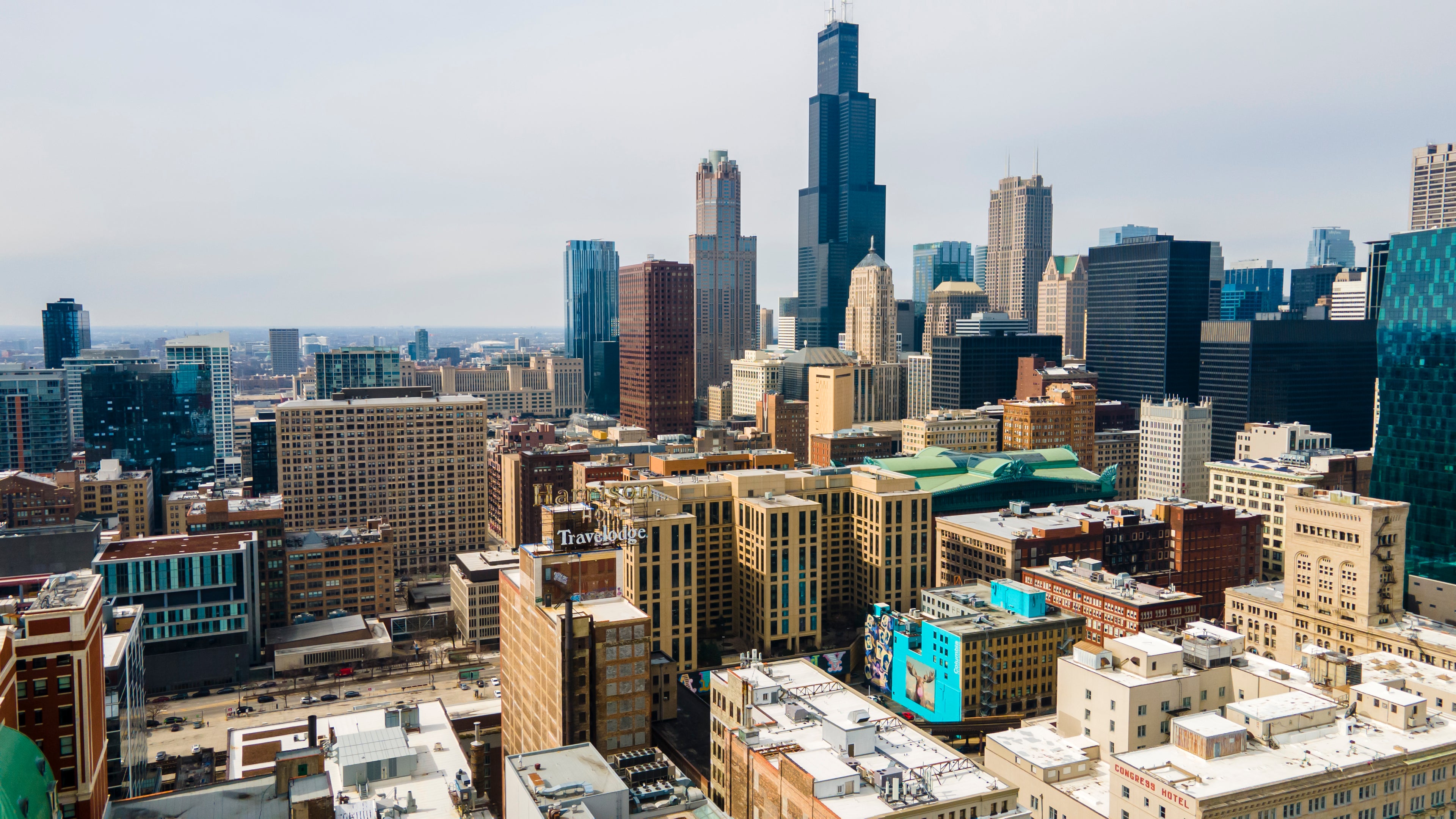Aerial drone of downtown chicago over the riverwalk - Art Print
